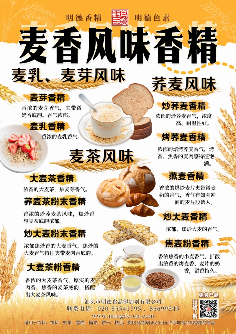 明德麥香風味香精 谷物焙香 層次飽滿汕頭市明德食品添加劑有限公司推出的麥香風味香精系列,覆蓋麥乳、麥芽、蕎麥、大麥茶、燕麥、小麥粉等多種谷物調性。產品風味真實、層次清晰,留香穩(wěn)定,適用于飲料、雪糕、糖果、烘焙與休閑零食等B端應用,幫助工廠快速打造具有記憶點的麥香風味。